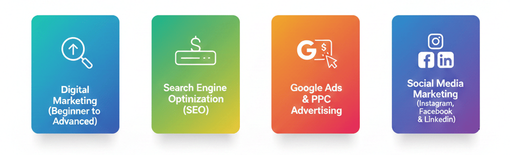 Our AI-powered digital marketing training focuses on practical learning through real-time projects. Students work on live campaigns involving SEO, social media marketing, paid ads, and AI-based tools. Each project is designed to simulate real business goals such as lead generation, traffic growth, and brand building.