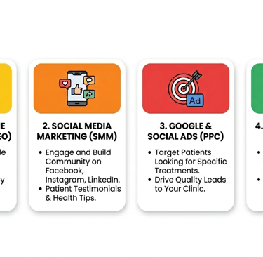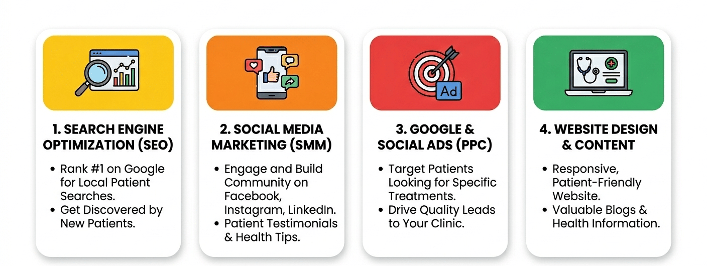 Digital marketing helps doctors and clinics attract more patients, build trust, and grow their practice online. Today, most patients search on Google before visiting a clinic. That’s why having a strong online presence is very important.