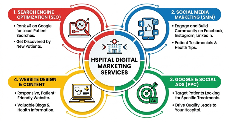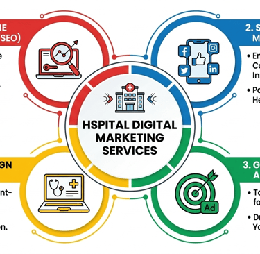 Hospital Digital Marketing Services in Burari, Delhi help healthcare providers increase their online visibility and attract more patients through strategic and result-driven marketing solutions. These services include local SEO to rank hospitals on Google search and Google Maps, social media marketing to build trust and awareness, Google Ads for instant patient leads, website development for appointment bookings, and reputation management to improve reviews and credibility.