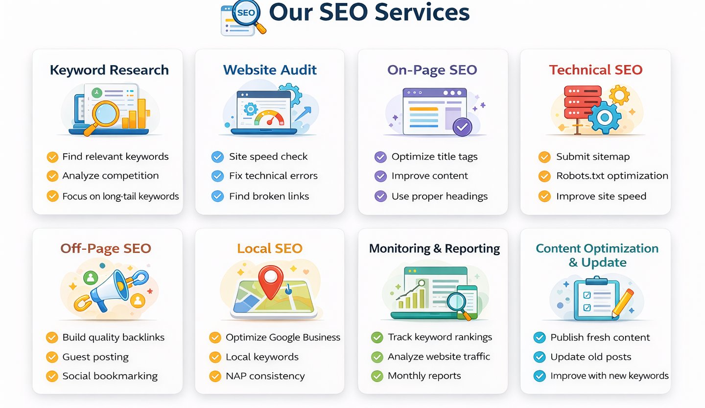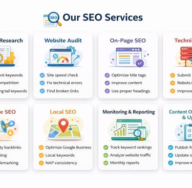 SEO is the process of improving your website so that it ranks higher on search engines like Google. When your website appears on the first page, it increases trust, visibility, and chances of getting more inquiries without running paid ads.