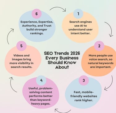 In 2026, SEO trends are focused on AI-driven search, user experience, and high-quality content. Search engines are prioritizing helpful, human-written content that matches search intent. Voice search and mobile-first indexing continue to grow, making fast-loading and responsive websites essential. Video SEO and visual search are becoming more important, especially on platforms like YouTube and Google Images.